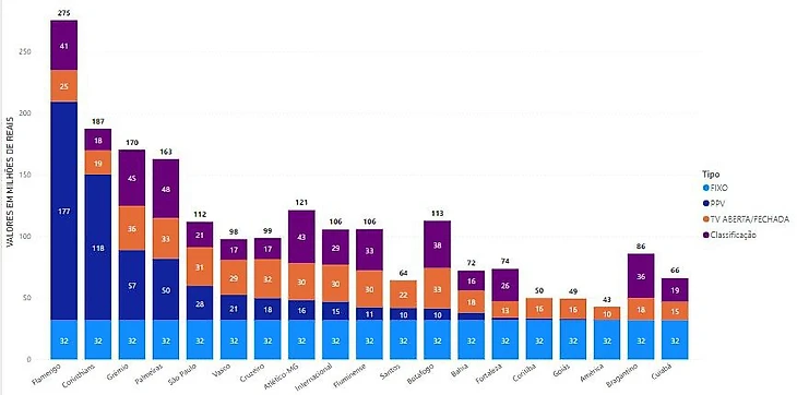 Самый большой доход от телевидения в прошлом году достался «Фламенго» - 275,2 миллиона реалов (около 55 миллионов долларов). Такая цифра сложилась из минимальной PPV (177,3 миллиона реалов), приза за четвертое место (40,6 миллиона реалов), показа на телеканалах Globo и SporTV (25,4 миллиона реалов), а также фиксированной квоты, разделенной между 19 клубами, подписавшими контракт с телекомпанией в обоих СМИ (31,9 миллиона реалов).