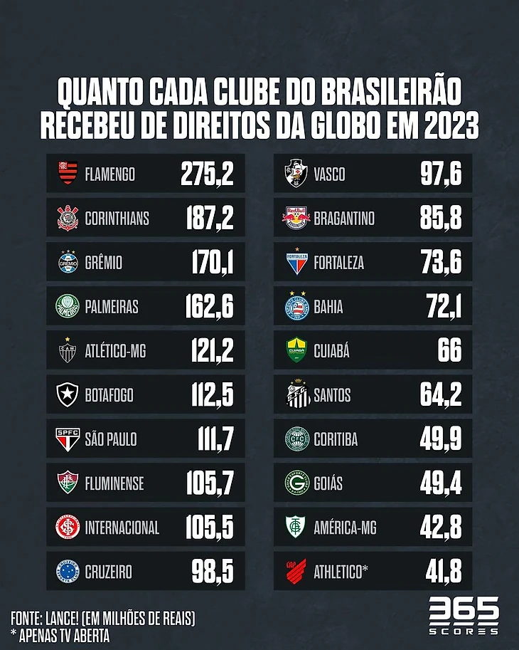 Пока же Globoesporte опубликовало сколько же клубы Серии А заработали по действующему телевизионному контракту