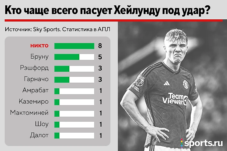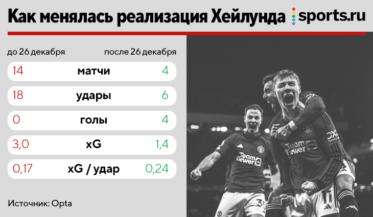 Не совсем. Скачок результативности Расмуса – следствие снятого психологического блока (вспоминаем эмоции в матче с «Астон Виллой»), возвращения травмированных игроков и адаптации самого форварда. Хейлунд, не получающий передачи от партнеров, создает голы самостоятельно.  Из четырех голов Хейлунда в АПЛ только один забит с ассиста – в матче с «Вест Хэмом» датчанину помог Каземиро.
