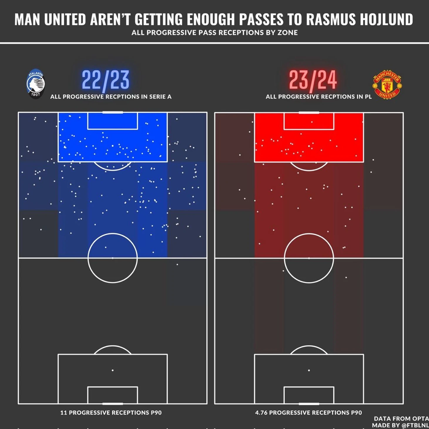 Главная проблема – полный игнор Хейлунда партнерами на флангах. Тактический автор The Devil’s DNA сделал сравнительную карту полученных продвигающих передач – суровая иллюстрация разницы между «МЮ» и «Аталантой». В Италии Расмус получал мяч в два раза чаще, чем в «МЮ».