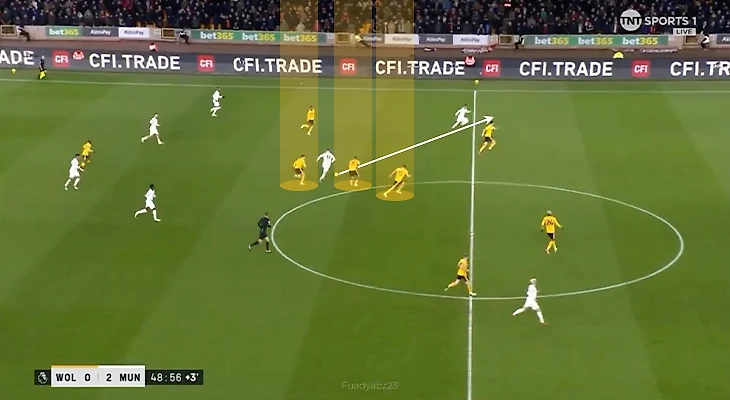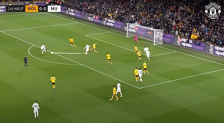 1. Матч с «Вулверхэптоном». Хейлунд получает мяч в центре, стягивает на себя трех соперников и запускает в прорыв Бруну. Опасный забег по флангам ничем не завершится – португалец отдаст странную передачу за лицевую.