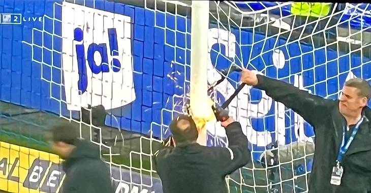 Начало второго тайма пришлось задержать, так как просто так замки снять не удалось. На поле вызвали людей с угловой шлифмашинкой (болгаркой).