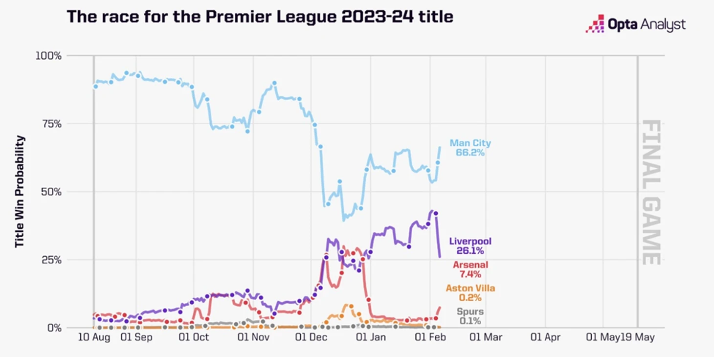 7 февраля Opta опубликовала статью с обновлённым прогнозом шансов клубов на победу в Английской Премьер-лиге. Из расчётов их суперкомпьютера следует, что главным претендентом на чемпионство является Манчестер Сити Пепа Гвардиолы. Помимо «горожан» за чемпионство активно борются Ливерпуль и Арсенал. Шансы команд по данным Opta выглядят следующим образом: