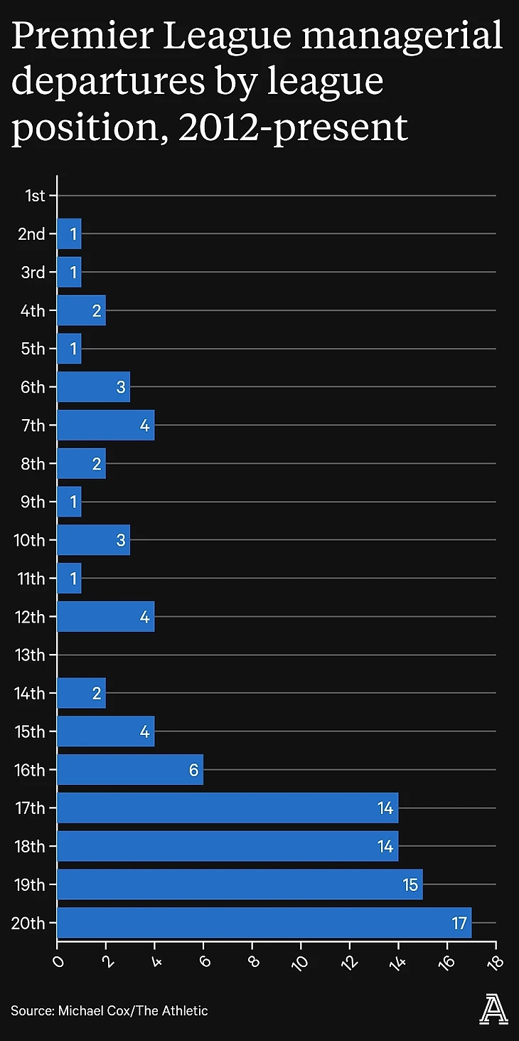 По данным начиная с 2012 года, менеджеров, занимающих 17-е место, увольняли столько же раз, сколько менеджеров, занимающих 12-е, 13-е, 14-е и 15-е места вместе взятые. Другими словами, 63 процента тренеров увольняются, когда их команда находится на четырех последних местах. Увольнение тренера почти всегда связано с попыткой сохранить свое место в Премьер-лиге.