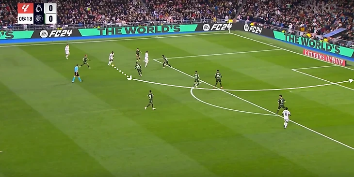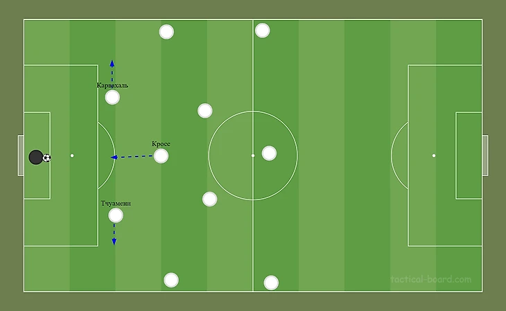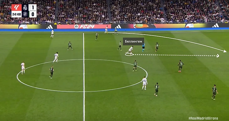 «Реал» играл без явно выраженного нападающего. Беллингем опускался ниже, помогал в развитии атаке защитникам. После перевода Кросса на Менди, посмотрите Беллингема. Он открылся за спину защитникам и вышел один на один с вратарем, забив гол.