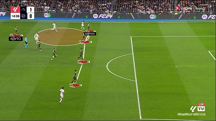 В первом голе Коуто застрял в атаке. Нагрузка легла на механизмы подстраховки. Правого защитника по эпизоду играл Мартин – он слишком легко пустил Вини в центр, где было свободно (как раз зона Мартина, если бы ему не надо было страховать фланг):