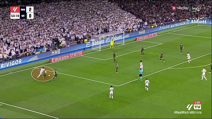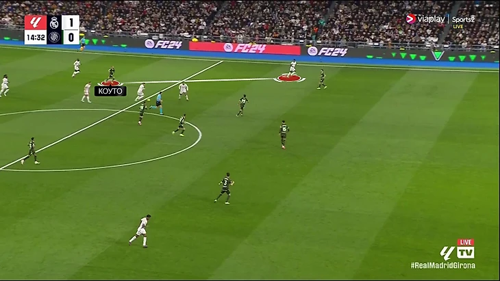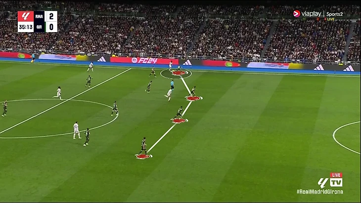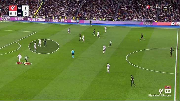Во втором тайме акценты сменились. Вместо трудяги Порту вышел Пабло Торре (лидер по разрезающим пасам, несмотря на статус резервиста). Он намного более индивидуальный игрок, но с акцентом на обострение. Эта замена олицетворяла намерение. Теперь «Жирона» готова была больше обострять (вернее – пытаться обострять), даже если не получается подготовить хорошие условия. На этом отрезке пошли провалы в моменты потери – «Мадрид» рвал на контратаках.