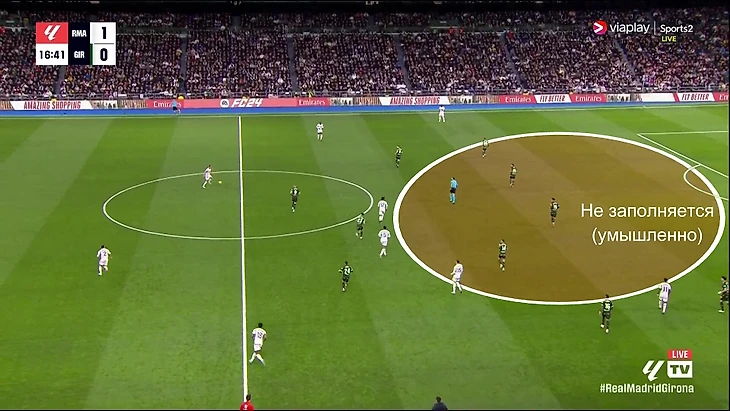 Такой подход предполагает больший упор на контроль (а не на обострение), чтобы было меньше переходных эпизодов. Также важно насыщать определенные зоны. Как и в дерби, «Реал» часто умышленно игнорировал заполнение центральной зоны в атаке: