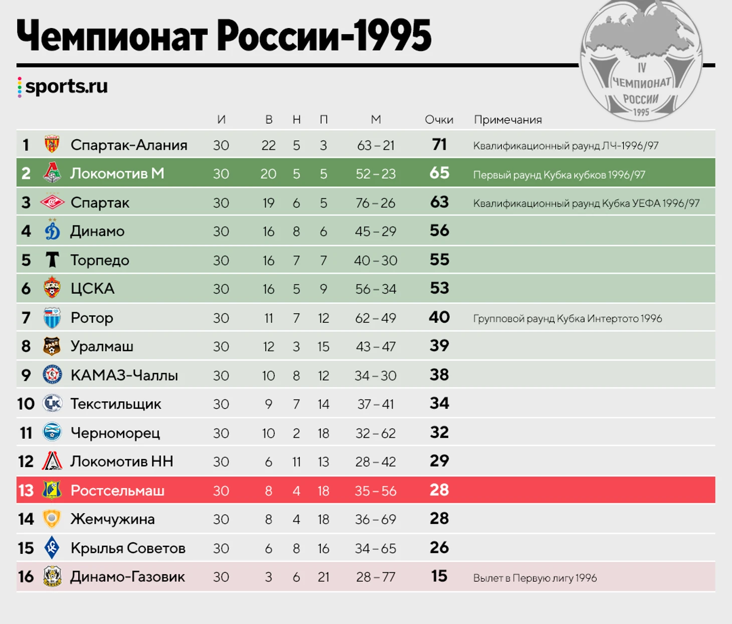 Просто таблица чемпионата России-1995, после которого Лоськов остался в «Ростсельмаше».