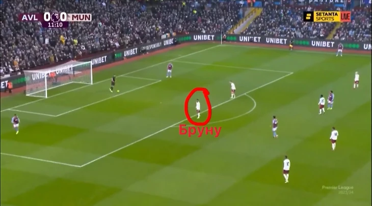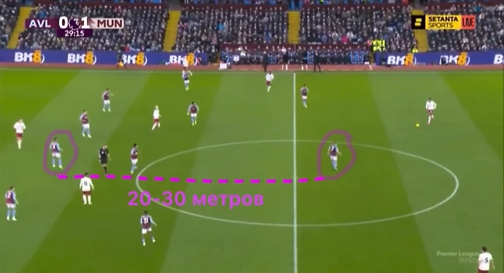 Отсюда и получался неплохой персональный прессинг. Кстати именно в этой ситуации, которая на картинке «Манчестер Юнайтед» имел очень хороший момент благодаря отбору после прессинга. Да и в целом Астон Вилла зачастую не могла выбраться и чувствовала себя не очень уютно при выходе, по крайней мере в первом тайме.