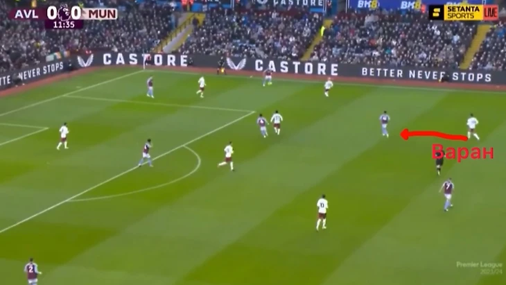 Механизм прессинга был следующий. Каземиро и Майну поднимались к опорным полузащитникам. Два форварда отвечали за за два центральных защитника, а два крайних полузащитника отвечали соответственно за крайних защитников Астон Виллы. Причем даже центральные защитники следовали за нападающими. Вот варан на картинке поднимается высоко.