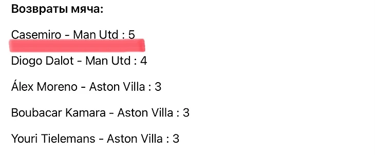 Кстати тут хочу отметить Каземиро. Я уже как-то писал пост про его возвращение после травмы и восхищался им. И я не перестану хвалить его. Потому что бразилец делает огромный объем работы, и в прессинге, который я описал выше, и в обороне, и в атаке. Когда смотришь матч, складывается ощущение, что он везде. Даже если взять статистику, то посмотрите, сколько у него возвратов мяча, наибольшее из находящихся на поле.