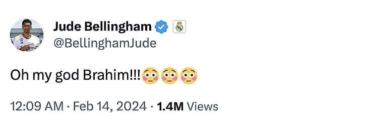 Сам Беллингем отреагировал прямо по ходу матча в твиттере. Так и написал: «О боже мой, Браим!!!»