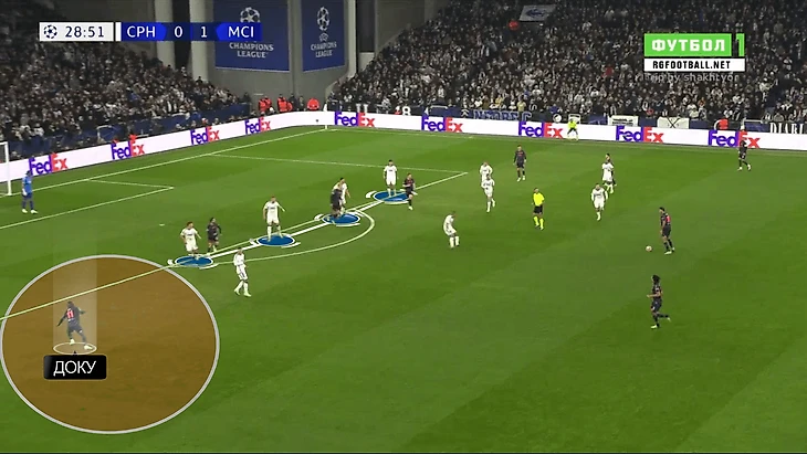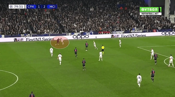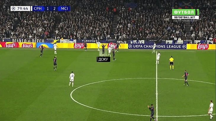 Тренер «Копенгагена» Якоб Нееструп решил сыграть в привычной манере – хозяева защищались по схеме 4-3-3. «Сити» быстро это распознал и бил любимым оружием, перегружая последнюю линию пятеркой. Гол Кевина де Брюйне – лишь один из примеров, когда получилось. Вот похожий эпизод, когда свободным остался Жереми Доку: