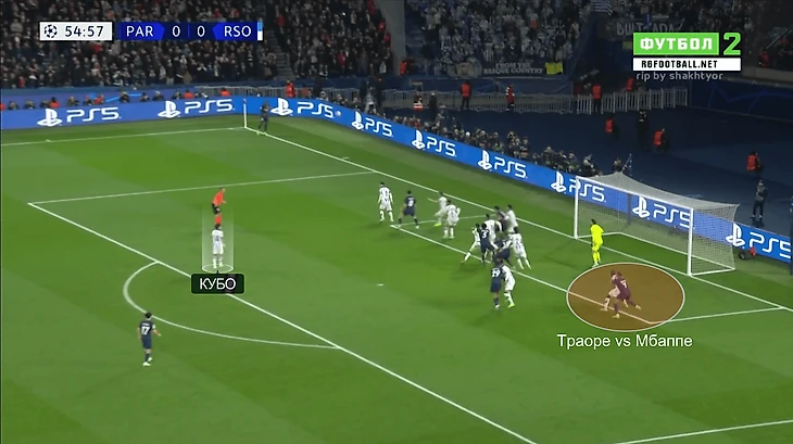 Тут же Кубо пришлось сдерживать одного из лучших нападающих мира. Не справился, а «Париж» очень сурово наказал. Траоре наблюдал за эпизодом за пределами поля.