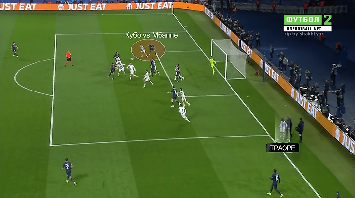 Особенно обидно гостям должно быть из-за самого гола. Изначально Килиана Мбаппе на угловом держал правый защитник Амари Траоре, но после первого корнера малиец получил травму и покинул поле, чтобы подлечиться. Несмотря на то, что у «Реала» было полно времени, чтобы перестроиться, на следующем угловом роль Траоре почему-то взял сверхатакующий (и вообще-то очень низкорослый) Кубо.