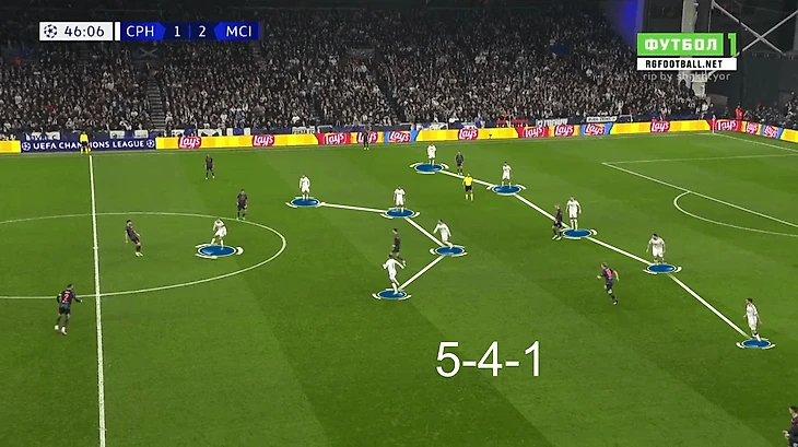 К перерыву «Сити» вполне мог уходить в отрыв, поэтому Нееструпу пришлось действовать. Выбрал подход Роджерса и Бенитеса и перестроил «Копенгаген» на пятерку: