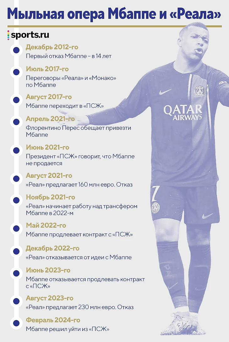 В июле 2022-го Мбаппе сообщил руководству, что недоволен вектором развития «ПСЖ», и запросил продажу. Как пишет The Athletic со ссылкой на источники, близкие к игроку, «ПСЖ» наложил вето на переход в «Реал» и потребовал 400 млн евро.