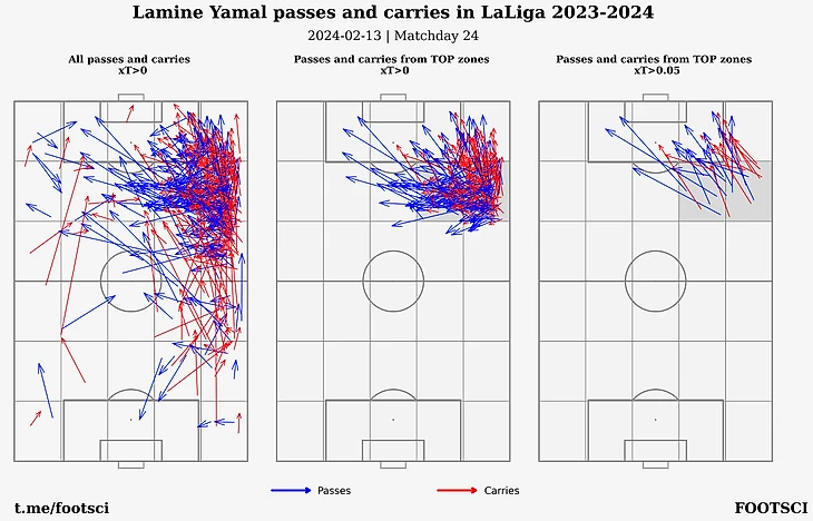 На правом фланге и полуфланге атаки выделяется восходящая звезде Барселоны - Ламин Ямаль. Для сравнения ниже представлена его карта передач и продвижений. Его действия являются более сбалансированными - примерно по 50% испанский футболист создает как с передач так и на дриблинге.
