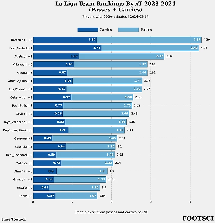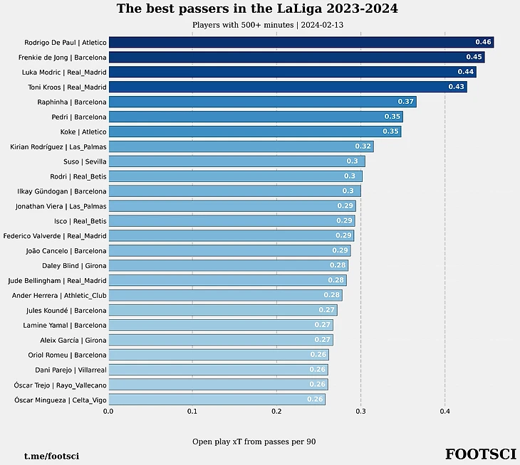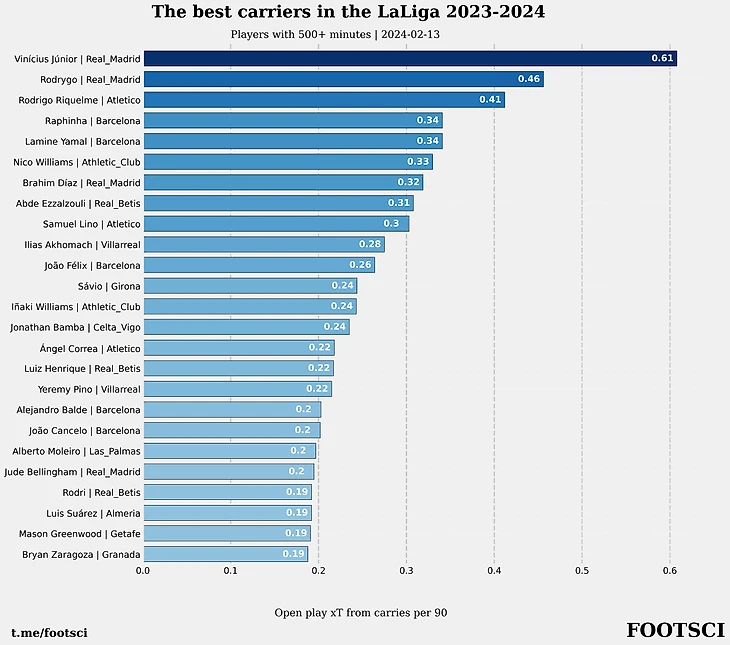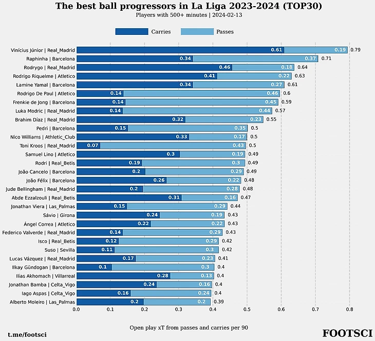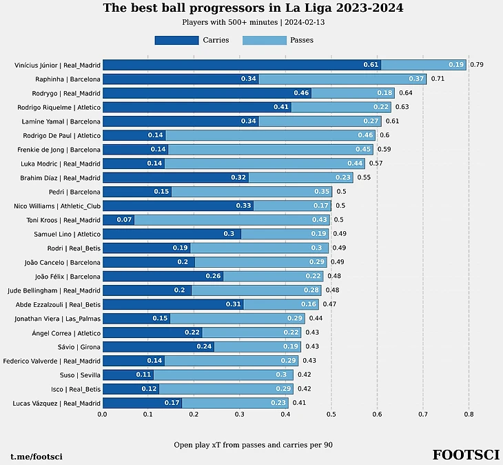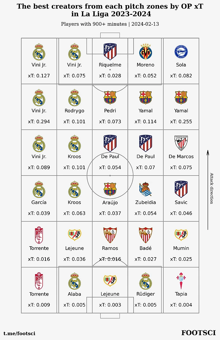 ЛаЛига через призму метрики xT. Доминирование Барсы и Реала. Де Пауль лучший в лиге по передачам. Винисиус - в дриблинге