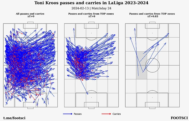 Левая картинка зашумлена и не несет в себе большого смысла. Центральная и правая представляют наибольший интерес в контексте сравнения с Кроосом. Видно, что аргентинский полузащитник создает наибольшую опасность почти вертикальными передачами в штрафную.
