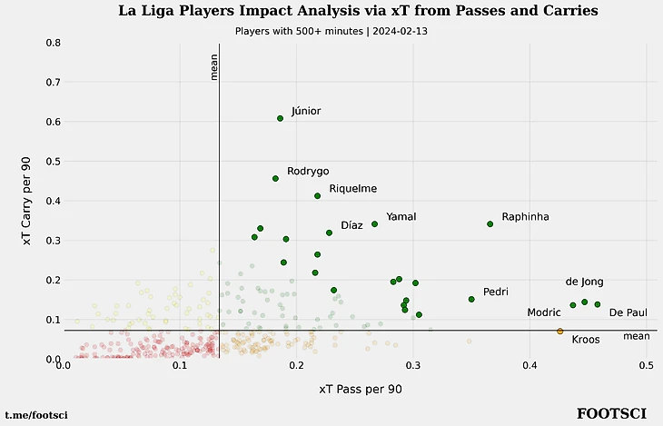 Видно, что помимо Крооса все 24 игрока попадают в правый верхний квадрант. Эта область зеленых точек, которая соответствует более высоким значениям метрики xT в сравнении со средними по ЛаЛиге. Немец находится чуть ниже среднего уровня по моментам, создаваемым через дриблинг, но при этом является четвертым в лиге по эффективности передач.