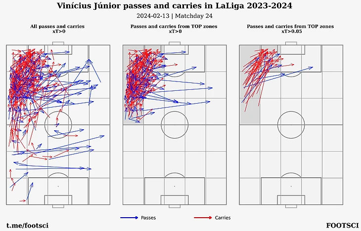 Винисиус создает моменты лучше всех в лиге сразу из четырех зон. Слева на картинке отображены все передачи и продвижения с положительными значениями xT. В центральной части приводятся только действия, совершенные из зон, в которых доминирует бразилец. Справа отдельно выделены самые опасные по xT действия.