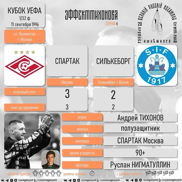 А вот и история, от имени которой все и началось. Расскажу только о своих ощущениях в тот момент. Т.к. Тихонов из моего города, играл за мой любимый клуб, то за ним всегда следил более внимательно. В тот момент (1996) Андрей был просто на топе. Все восхищались им и он не давал поводов усомниться в себе. И то, что он встал в ворота вместо Нигмы, я очень сильно переживал, что если он пропустит, то его имидж сильно испортиться. НО - когда он вытащил штрафной - мне показалось, что на небосклоне футбольных богов добавился еще один.