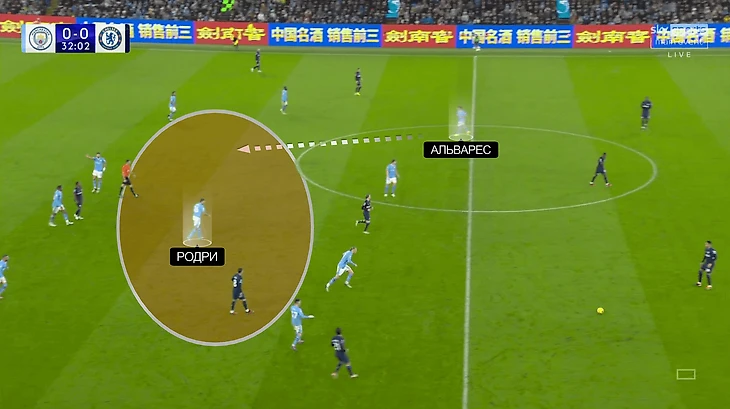 Проблемы были двух типов. Во-первых, иногда Хулиан просто-напросто не успевал вернуться из нападения (его роль с мячом) в опорную (роль без мяча). Родри оставался в одиночестве. Вот показательный эпизод. Испанец вынужден патрулировать огромное пространство, Альварес в этот момент лишь возвращается на свою половину.