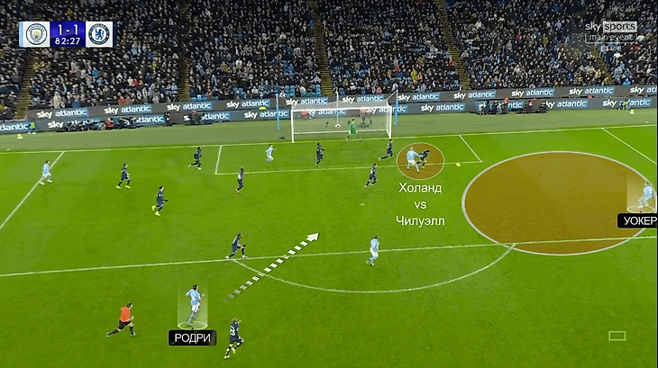 Момент с голом, в котором все три фактора сработали напрямую. Холанд заблокировал Чилуэлла во время навеса. Уокер оказался свободным на дальней. А Родри – остался без опеки в опорной: