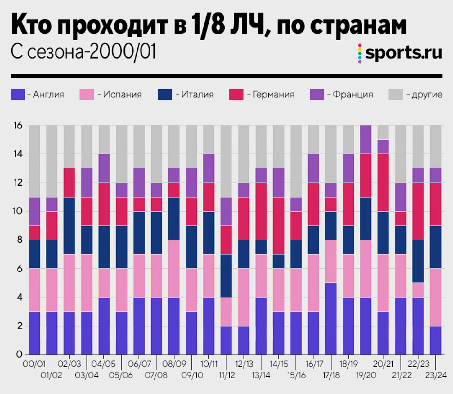 Из топ-лиг 1/8 финала однажды пропускала только Франция (2002/03). Остальные чемпионаты представляла минимум одна команда – АПЛ всегда не меньше двух.