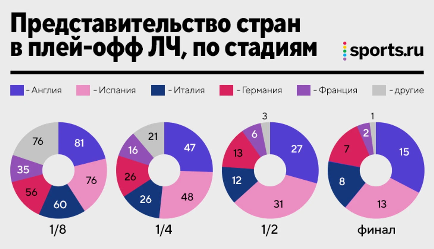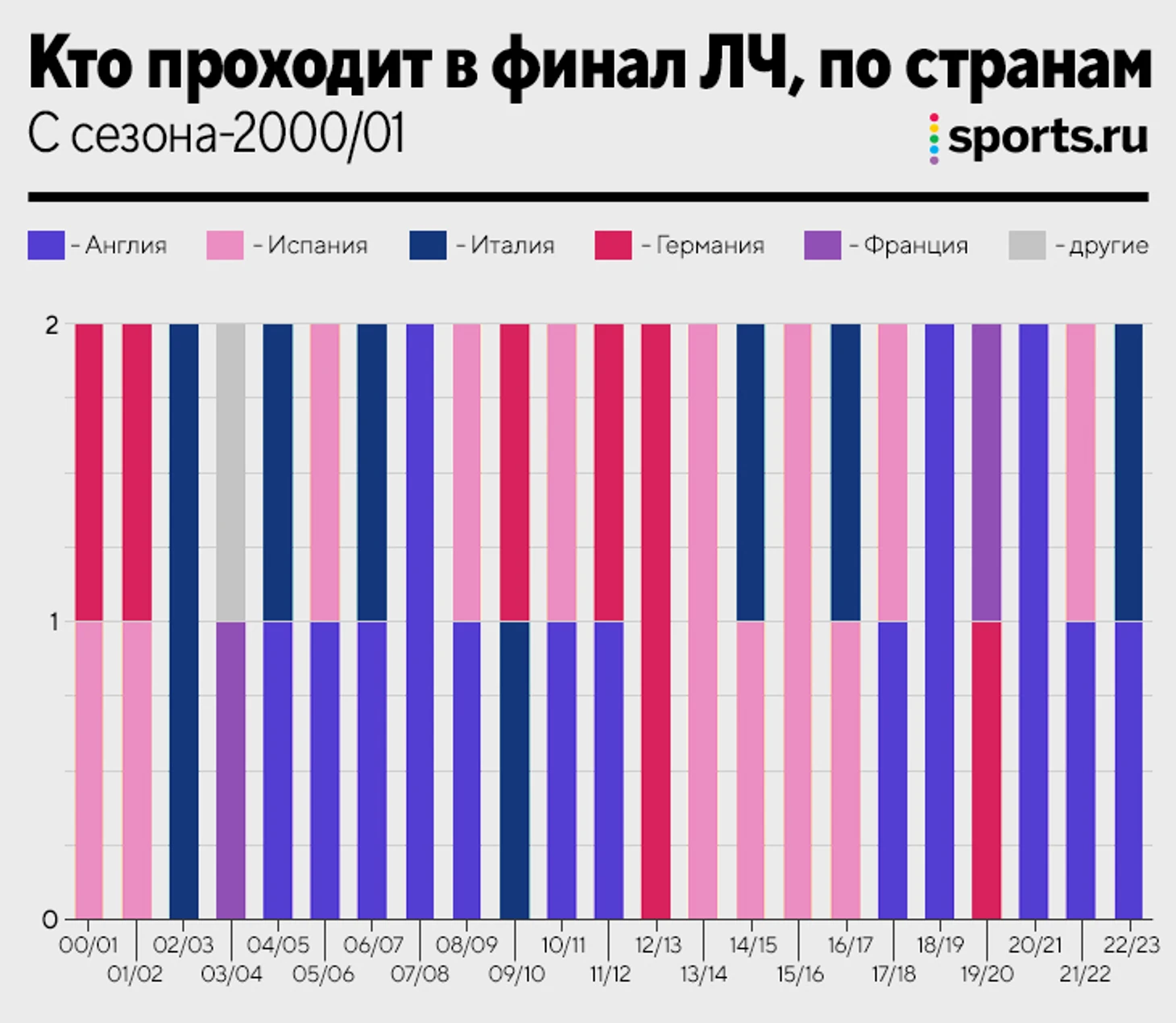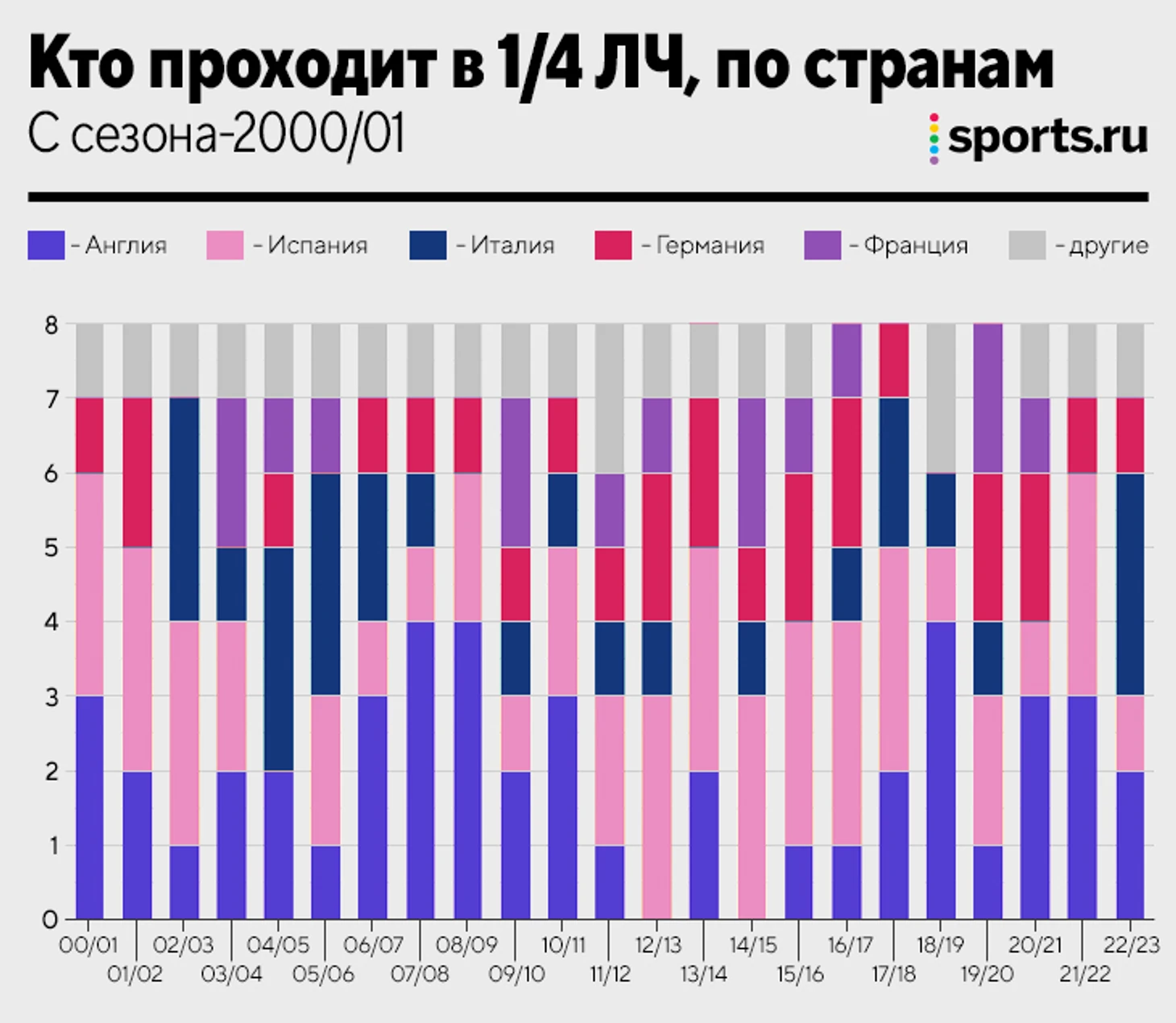 Мы оценили, клубы из каких стран выходили в плей-офф за весь XXI век, и как представители конкретных лиг потом продвигались по весенней сетке к финалу.