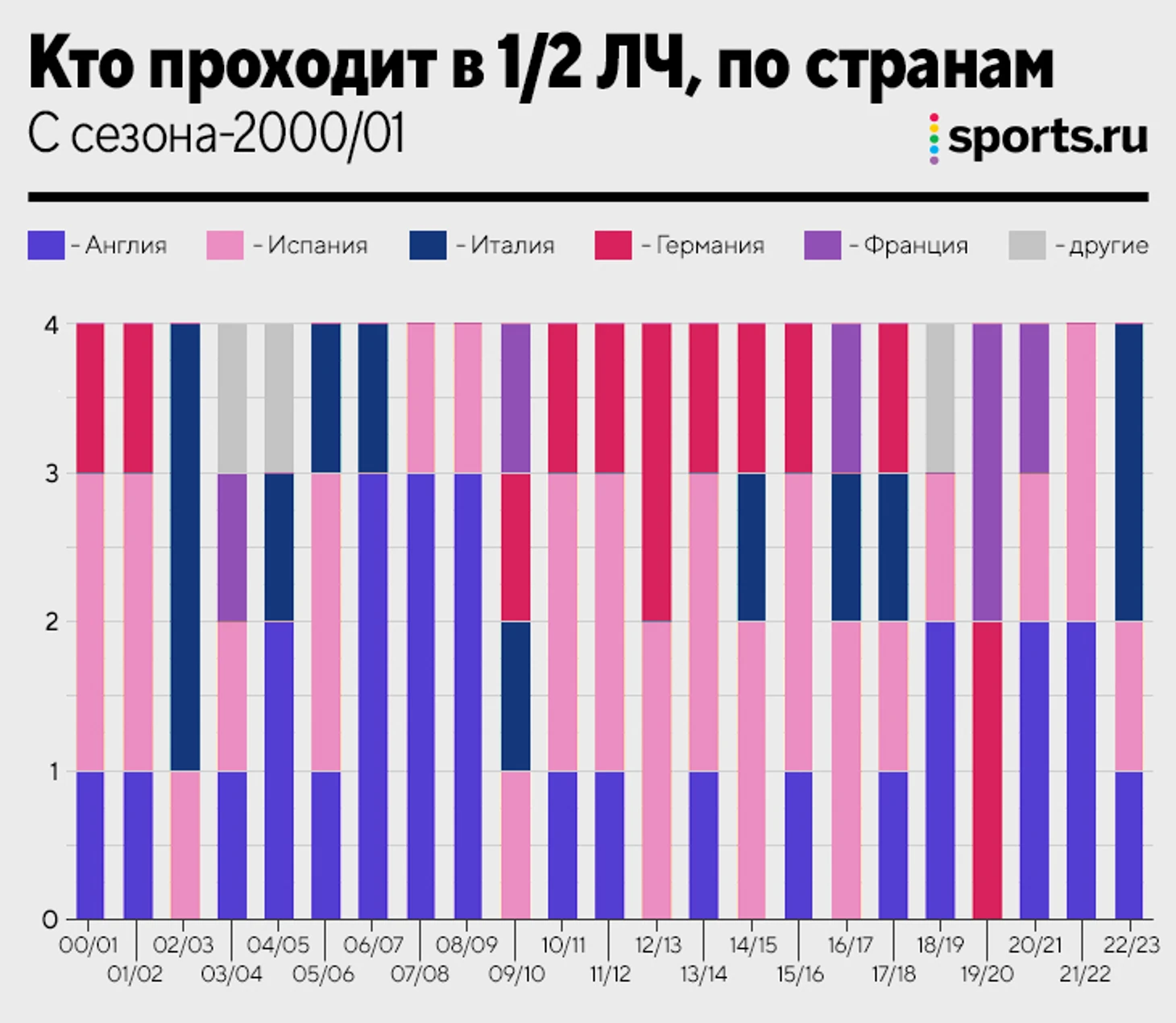 Ла Лига и АПЛ доминируют в полуфиналах: на двоих 59 из 92 полуфиналистов XXI века (64%).