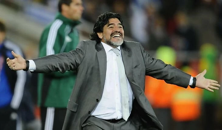 В 1998 году Марадона изъявил желание стать наставником сборной Аргентины, в чем ему было отказано. Но спустя десять лет его желание осуществилось. В штаб команды вошли несколько помощников, в том числе, опытный Карлос Билардо. Первый год под руководством Диего нельзя назвать удачным для команды Аргентины, в него уместилось поражение от сборной Венесуэлы со счетом 1 : 6. Все это время Марадона работал бесплатно, а официальный контракт был подписан только летом 2009 года. Сборная пробилась на чемпионат мира 2010 года, но тренер не включил в нее опытных Хуана Рамона Рикельме, Эстебана Камбьяссо, Хавьера Дзанетти, за что подвергся критике. Тем не менее на групповом этапе аргентинцы одержали три победы подряд, выиграли и в 1/8 финала у сборной Мексики. В четвертьфинале последовало разгромное поражение от команды Германии со счетом 0 : 4. Оно стало самым крупным для сборной Аргентины за всю историю выступлений на чемпионатах мира. Контракт с Диего Марадоной федерация не продлила.
