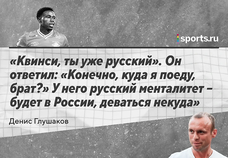 Денис Глушаков говорит про русский менталитет: «Встречался с ним до игры с «Ростовом» в Москве, где «Спартак» победил. Мы сидели, общались. Сказал ему: «Квинси, ты уже русский». На что он мне ответил: «Конечно, я русский. Куда я поеду, брат? Я уже здесь. Ты же знаешь меня». И я сказал: «Конечно, ты мой черный брат, а я твой белый брат».
