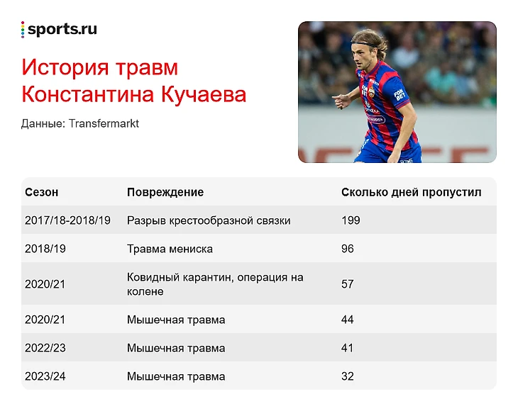 Кучаев ярко начал за ЦСКА: в 19 забил «Манчестер Юнайтед» (1:4) в ЛЧ и ассистировал в ЛЕ на победные голы «Црвене Звезде» (1:0) и «Лиону» (3:2). А в мае 2018-го порвал кресты.