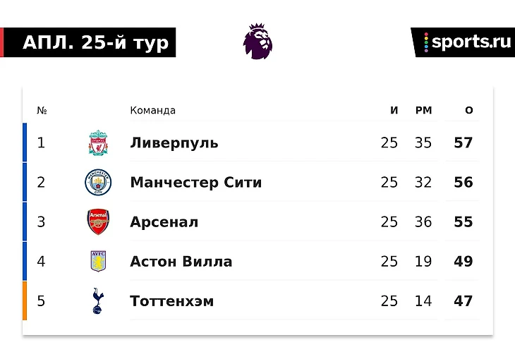 Интрига закручивается все мощнее: теперь у «Ман Сити» -1 от «Ливерпуля» и +1 от «Арсенала».
