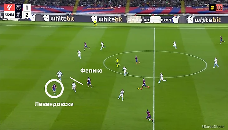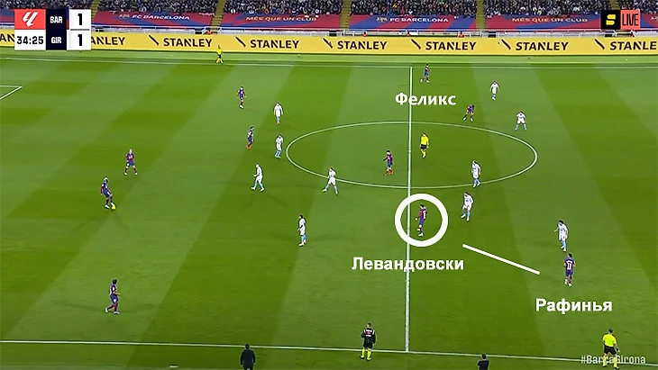 Подобные рывки вынуждают партнеров подстраиваться. Роберт тоже помогает, эпизодами подменяет партнера на фланге, пока тот рвется вперед. Пример с Феликсом из игры с «Жироной».
