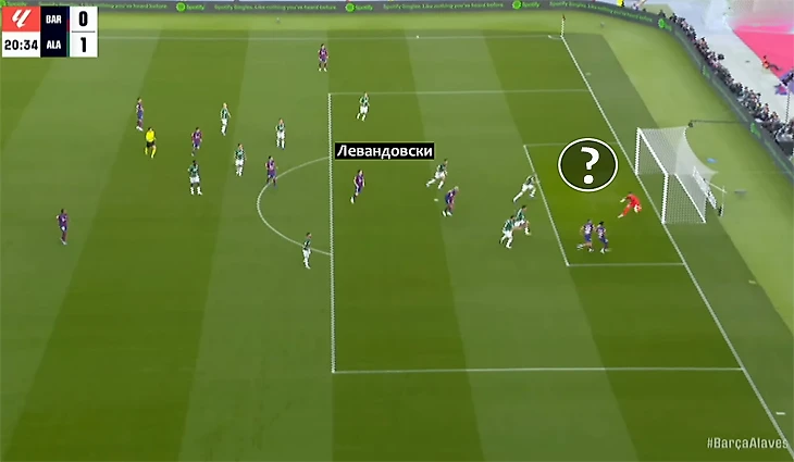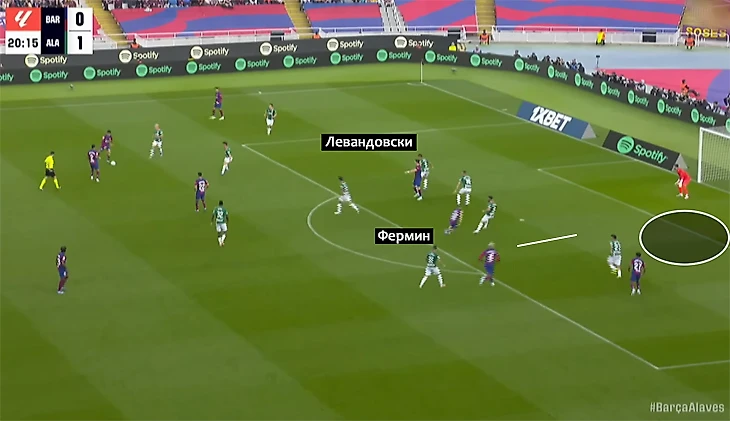 Визуально кажется, что у Роберта пропало голевое чутье. Он почти не врывается во вратарскую. Пример из домашнего матча с «Алавесом»: Педри забрасывает на угол вратарской, открывается Фермин Лопес.