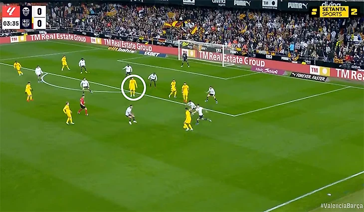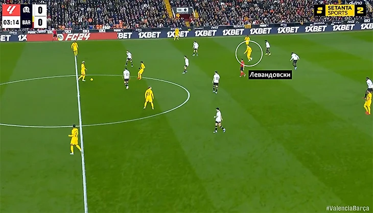 Фермин классно принимает мяч, логичный шаг – пас на другой край вратарской, но Левандовского там нет. Он досматривает эпизод со стороны.
