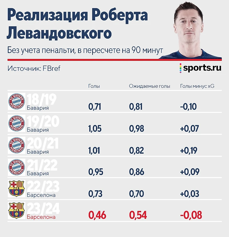 Реализация – переменная величина. Беда в том, что Левандовски просто не получает так много шансов, как в «Баварии». Там проблемы Роберта иногда перекрывали количеством моментов: например, в сезоне-2018/19 форвард забил на восемь голов меньше, чем ожидалось по цифрам, но тот год он закончил с 40 мячами во всех турнирах. Такое невозможно в нынешней «Барсе».