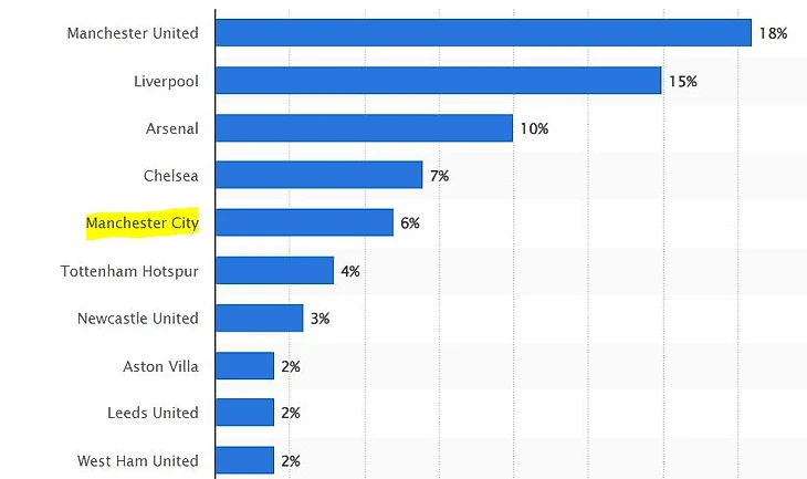 Конечно, это очень маленькая и субъективная выборка, поэтому я попытался найти более серьезные данные. Например, результаты опроса, проведенного в 2023 г. порталом Statista, показыли, что за «Сити» болеет 6%, а самым популярным клубом остается «МЮ» с 18%.