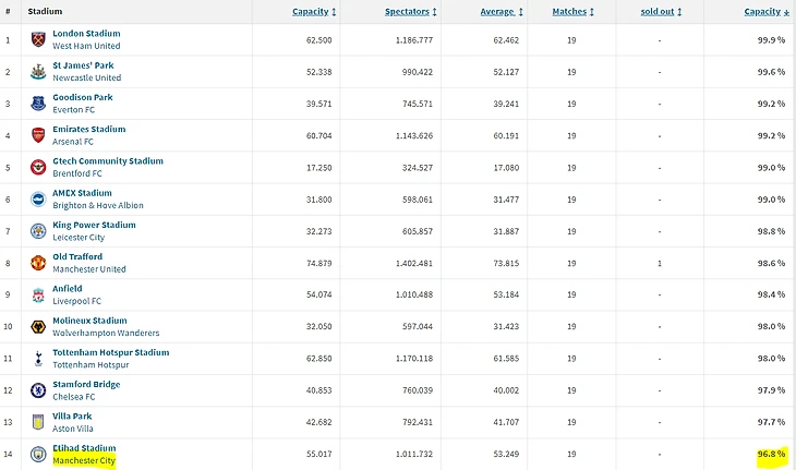 По данным Transfermarkt, средняя посещаемость «Этихад» в прошлом сезоне была 96.8% - это 14-е место из 20 (учитываются только матчи АПЛ). Если абстрагироваться от ранжирования клубов, то почти 97% это вполне достойная цифра, и катастрофы тут точно нет.