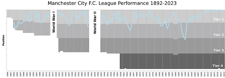 Трофеи. До шейхов команда выиграла два чемпионства, четыре кубка Англии, два кубка лиги и один еврокубок - всего 9 трофеев (исключая турниры из одного матча). Это ровно столько же чемпионств как, например, у «Тоттенхема», «Дерби Каунти» и «Бернли», и ровно в два раза больше, чем у «Челси» в эпоху до Абрамовича. Также стоит отметить, что большую часть 20-го века команда провела в высшем дивизионе английского футбола (см. чарт ниже)