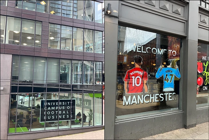 То, что Манчестер это город футбола, осознаешь быстро. Сразу после выхода из вокзала нас встречает факультет футбольного бизнеса при одном из университетов. А питейные заведения предлагают заглянуть на «дринк» вне зависимости от того, кого из двух грандов вы поддерживаете.