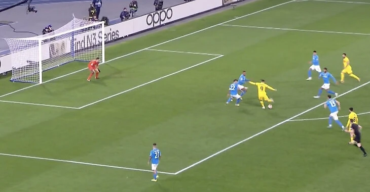 А теперь сравните: прошло 15 минут, очень похожий шанс получил Виктор Осимхен. Только защитники повели себя чуть иначе, нигерийца держал Иньиго Мартинес, но в единоборстве испанец упал, и форварду «Наполи» бить в итоге никто не мешал.