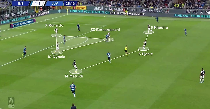 Миралем Пьянич поднимался из глубины лишь для того, чтобы переводить зону контроля из одной части поля в другую, но больше функционал Пирло не старался исполнять. Он и не требовался, поскольку в полузащите располагались Хедира и Матьюиди, которые блестяще работали под любым прессингом и могли в одно касание вырезать всю оборону соперника, где уже ждали Дибала или Роналду. Но сегодня в «Юве» нет футболистов под эту схему от слова совсем, равно как и нет нападающего класса хотя бы приближенно к Роналду, чтобы из ничего создавать голевые эпизоды.