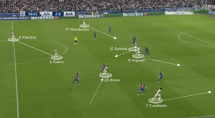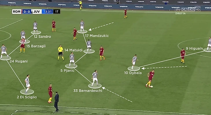 Случиться подобному позволил переход Марио Манджукича из позиции на острие атаки в левую часть центральной зоны поля, где хорват продолжал работать в сторону атаки, но при этом не боялся потерять позади себя зону за счет своевременного включения Алекса Сандро. В итоге Миралем Пьянич связывал зону обороны с флангами, где скоростные Манджукич и Куадрадо поочередно выбегали в освобождаемые защитниками коридоры, пока атакующий дуэт с купленным за 90 млн евро Гонсало Игуаином завязывал весь прессинг соперника на себе.