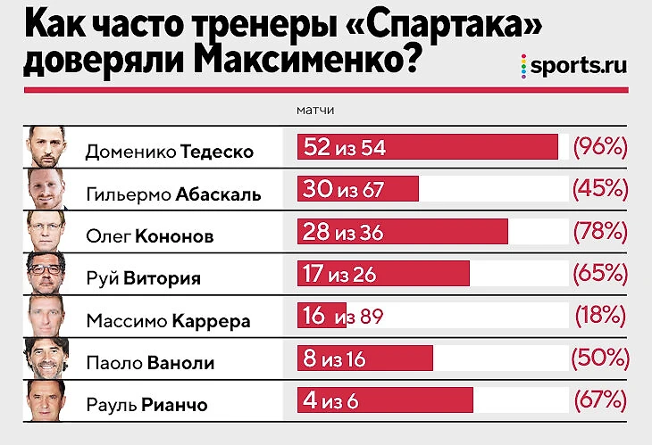 При Тедеско – 52 игры (из 54 матчей тренера в «Спартаке»), при Абаскале – 30 (из 67), при Кононове – 28 (из 36), при Витории – 17 (из 26), при Каррере – 16 (из 89), при Ваноли – 8 (из 16), при Рианчо 4 (из 6).