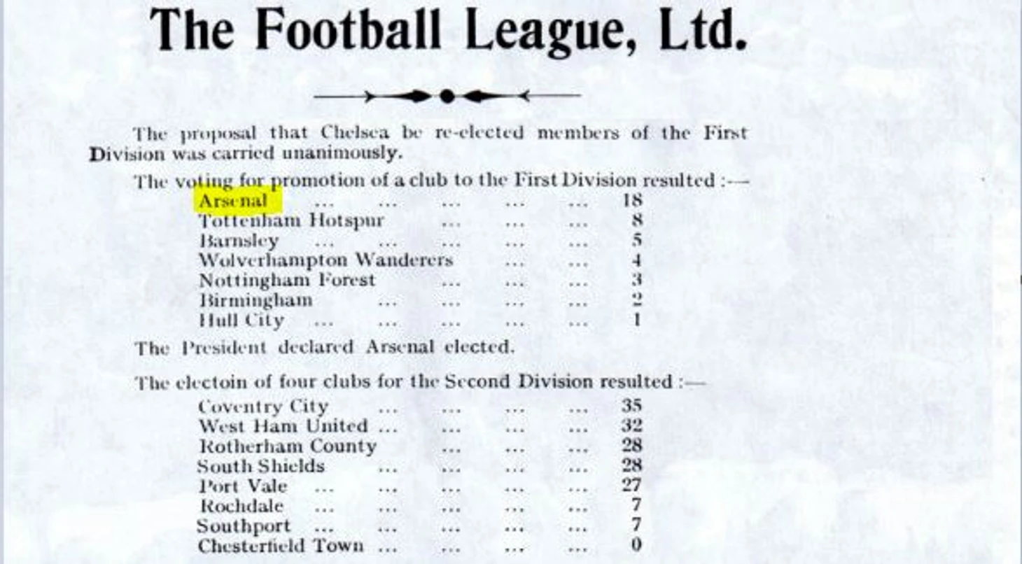 Тем не менее, казалось, что выбор должен был быть сделан между «Тоттенхэмом» и «Барнсли». Но неожиданно влиятельный глава «Арсенала» (а также бизнесмен и политик) Генри Норрис стал продвигать кандидатуру «канониров», занявших лишь шестое место во втором дивизоне (любопытно, что в 1975-м году была обнаружена ошибка в подсчете разницы голов, и «Арсенал» переместился на пятое).